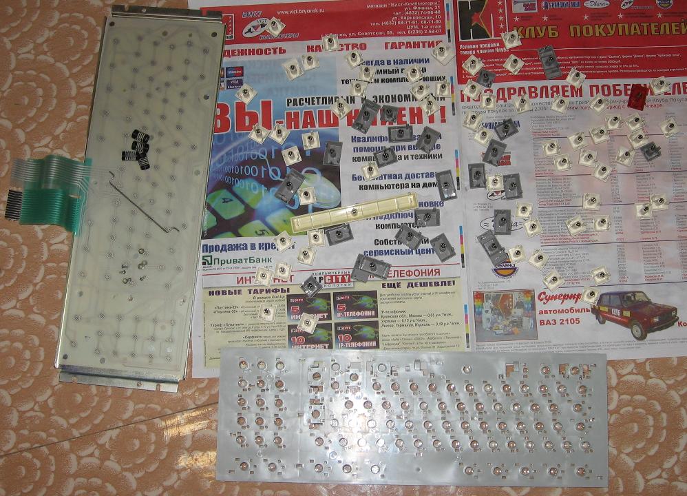Полностью разобранная клавиатура. Из всех пружинок выжило только 4 :-( Остальные школьники ... спионерили